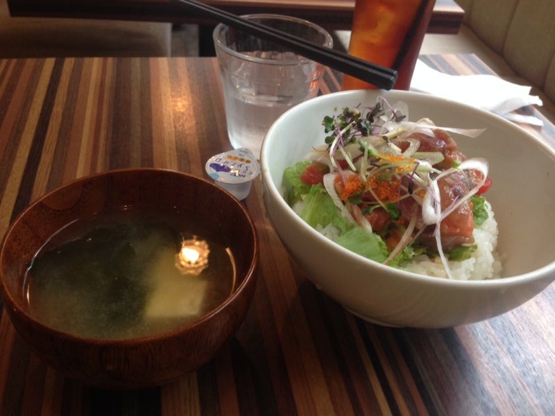 マグロアボカド丼です。ロコモコもそうですが、標準で味噌汁が付きます。