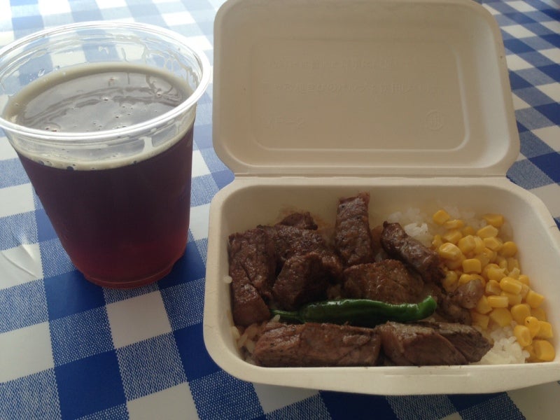 富士高原桜ビール「ラオホ」を若姫牛のステーキ丼と一緒にいただきます。