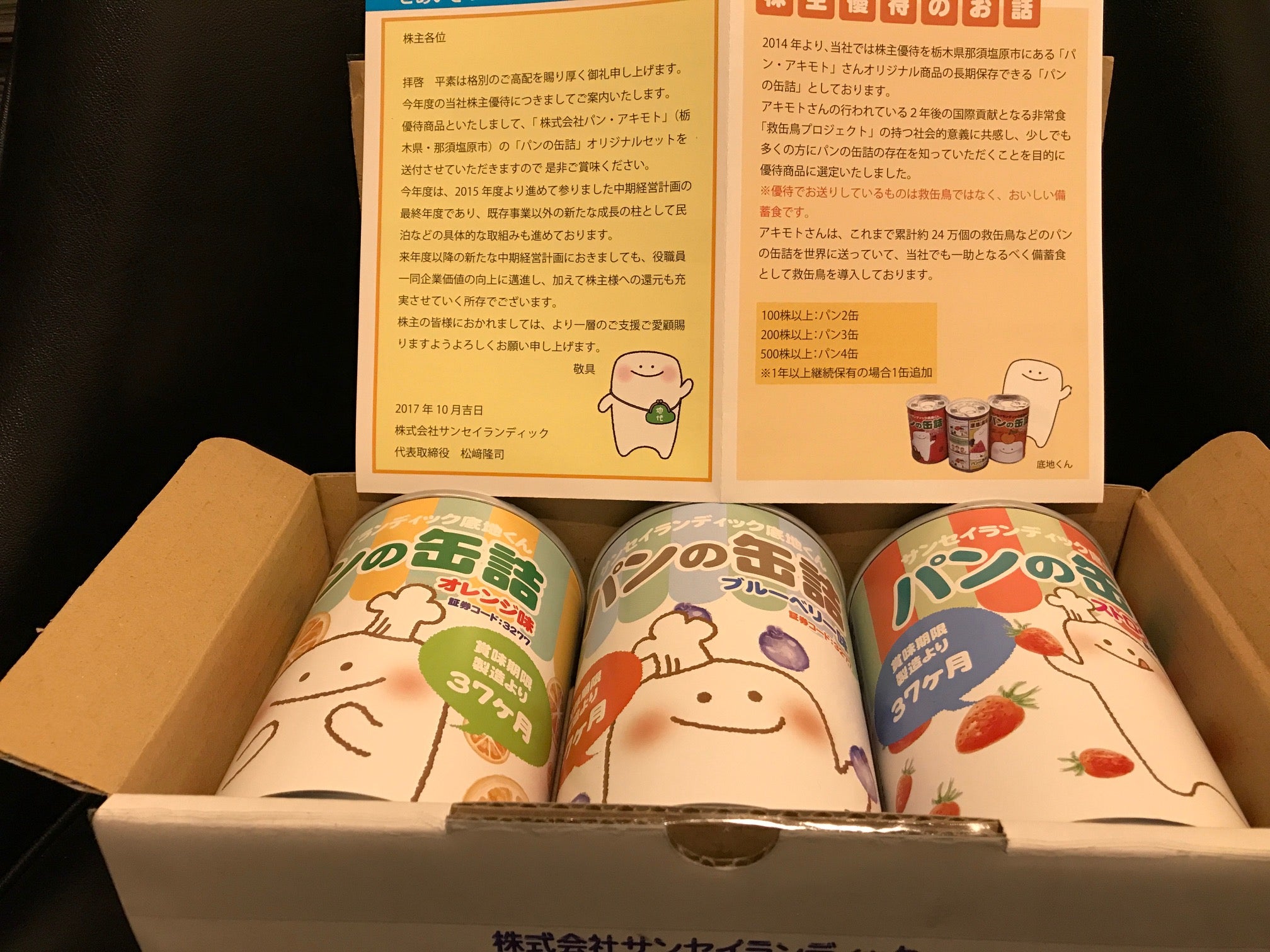 6月末の株主に対して、「パンの缶詰」を2缶進呈しておりますので、適当に