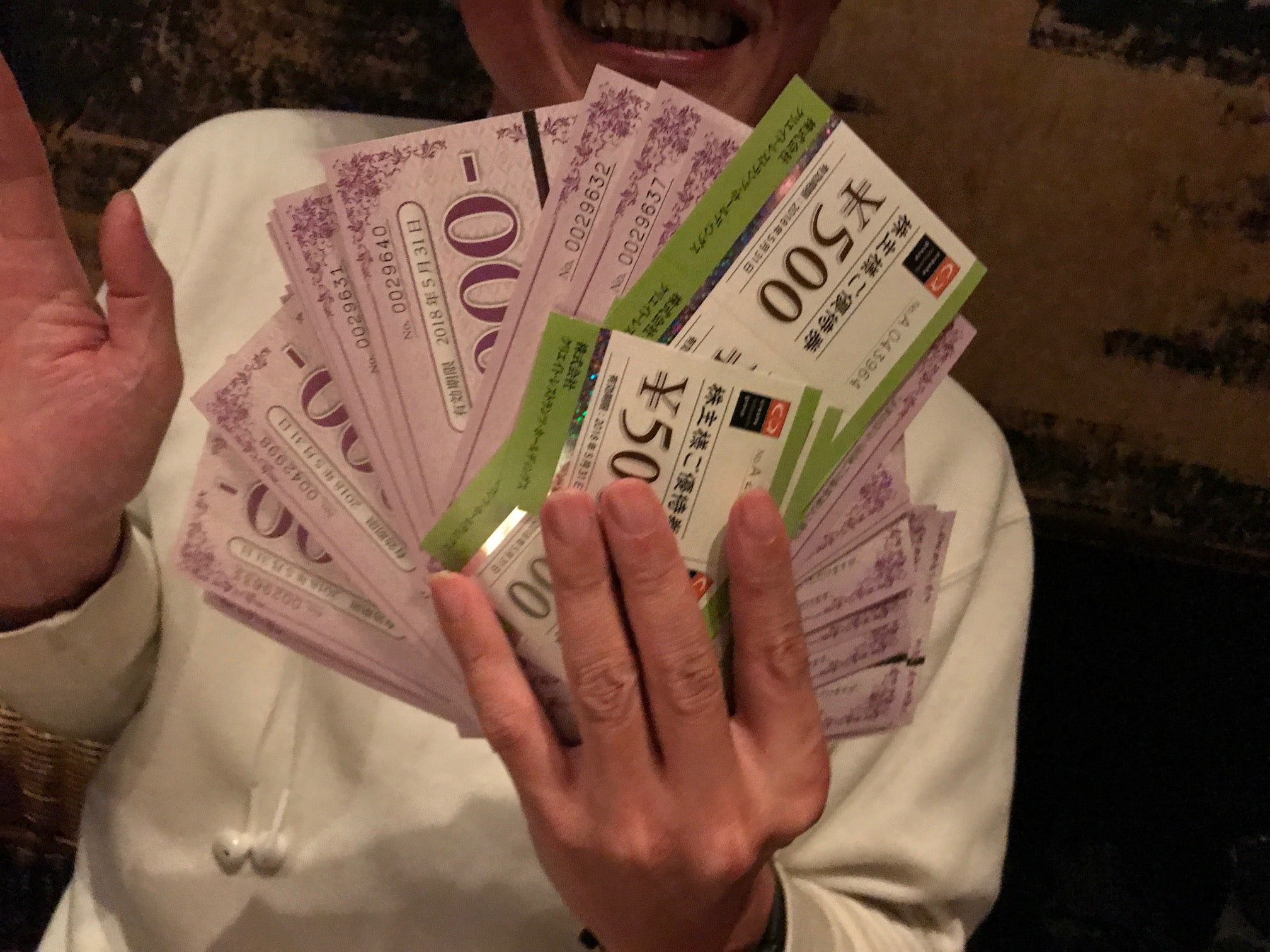 儲かりまくって笑いが止まらない御口元と数多の金券からそこはかとなく