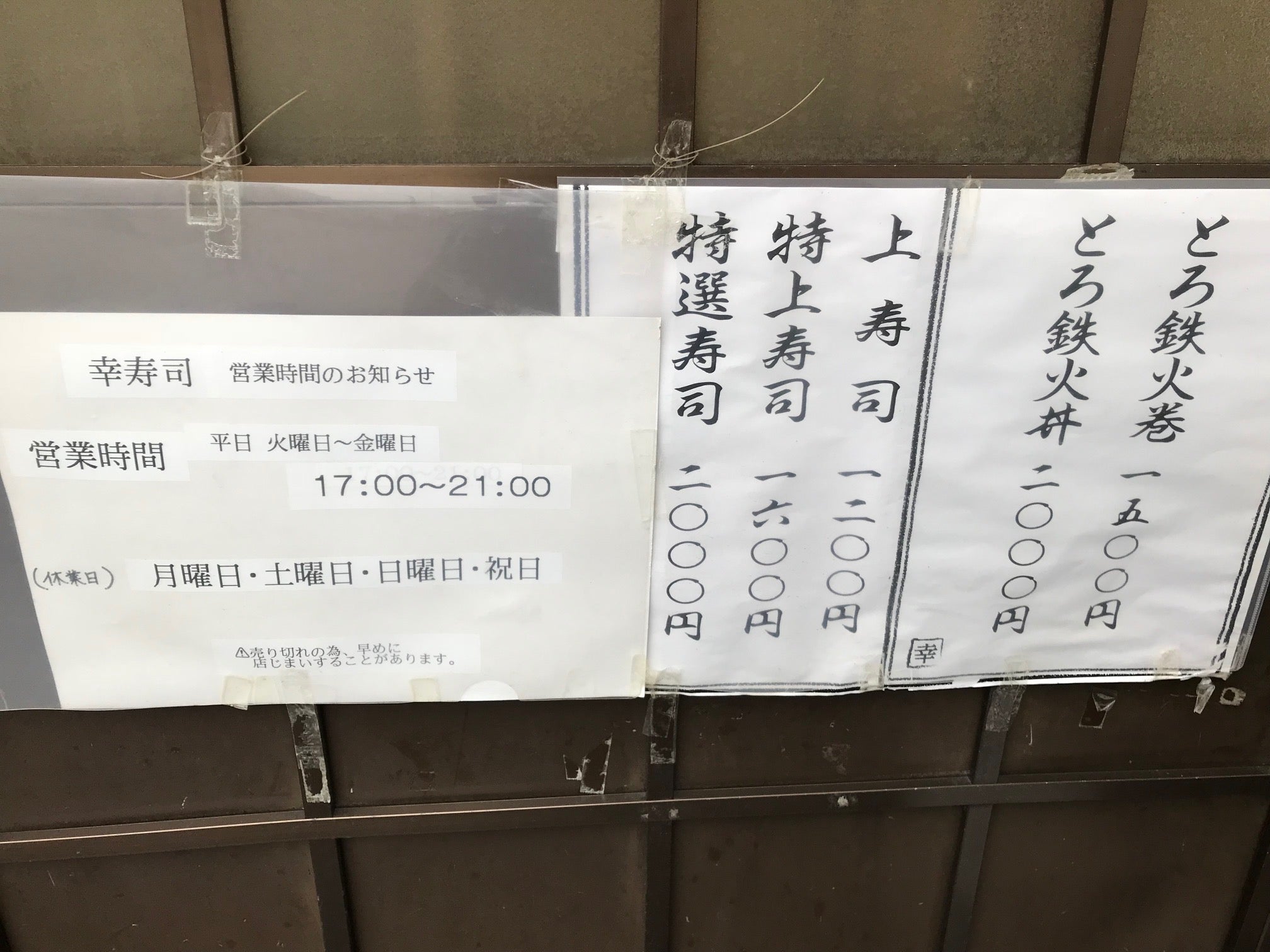 寿司でも2,000円という安さです。横に書いてある店休日が土曜・日曜・月曜・祝日という
