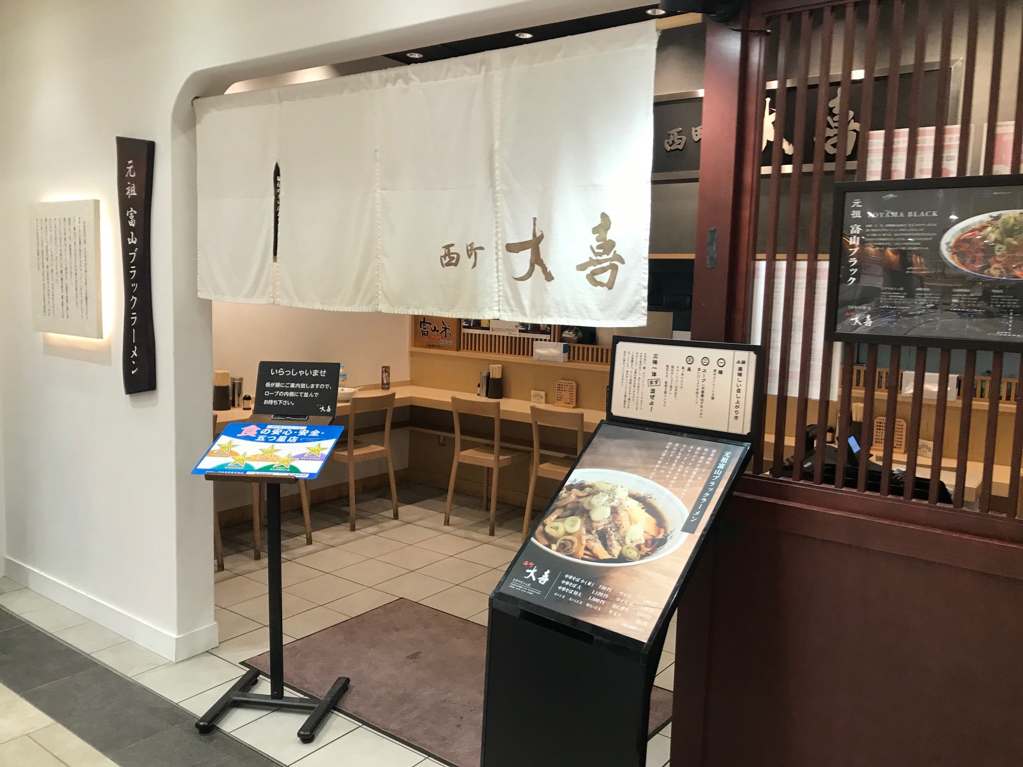 富山駅周辺でブラックラーメン店を展開する「西町大喜」のとやマルシェ店を訪店しました。