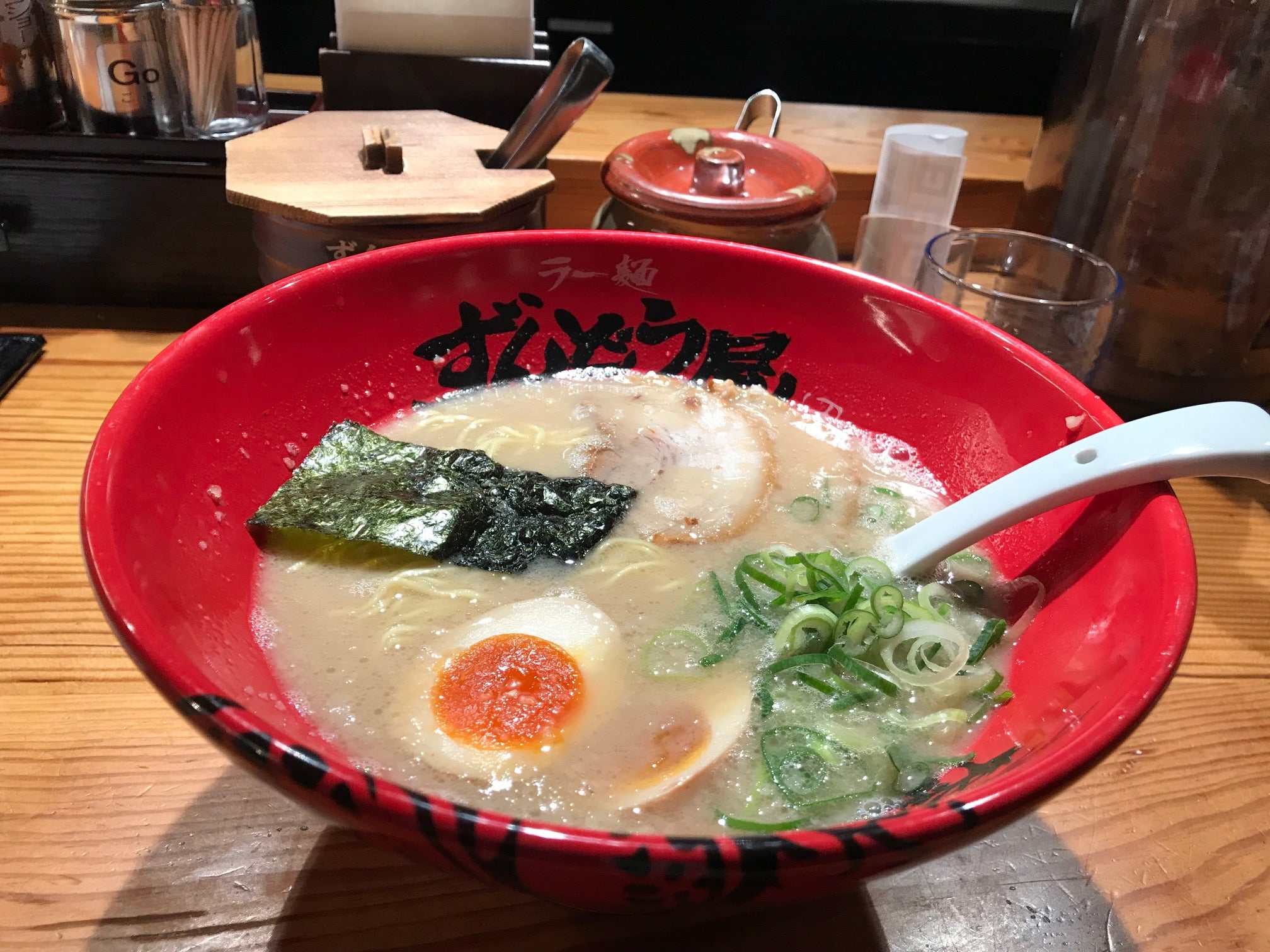 そもそも器が赤いので見た目的には華やかなのですが、分厚いながらもとろけるチャーシューや鮮やかな茹で具合の味玉、たっぷりのネギや海苔が添えられておりお得感があります。スープの方は非常に濃厚なとんこつスープであり、甘味があってクリーミーです。一風堂や一蘭より濃厚ですが、天下一品ほどではない・・・といった感じでしょうか。