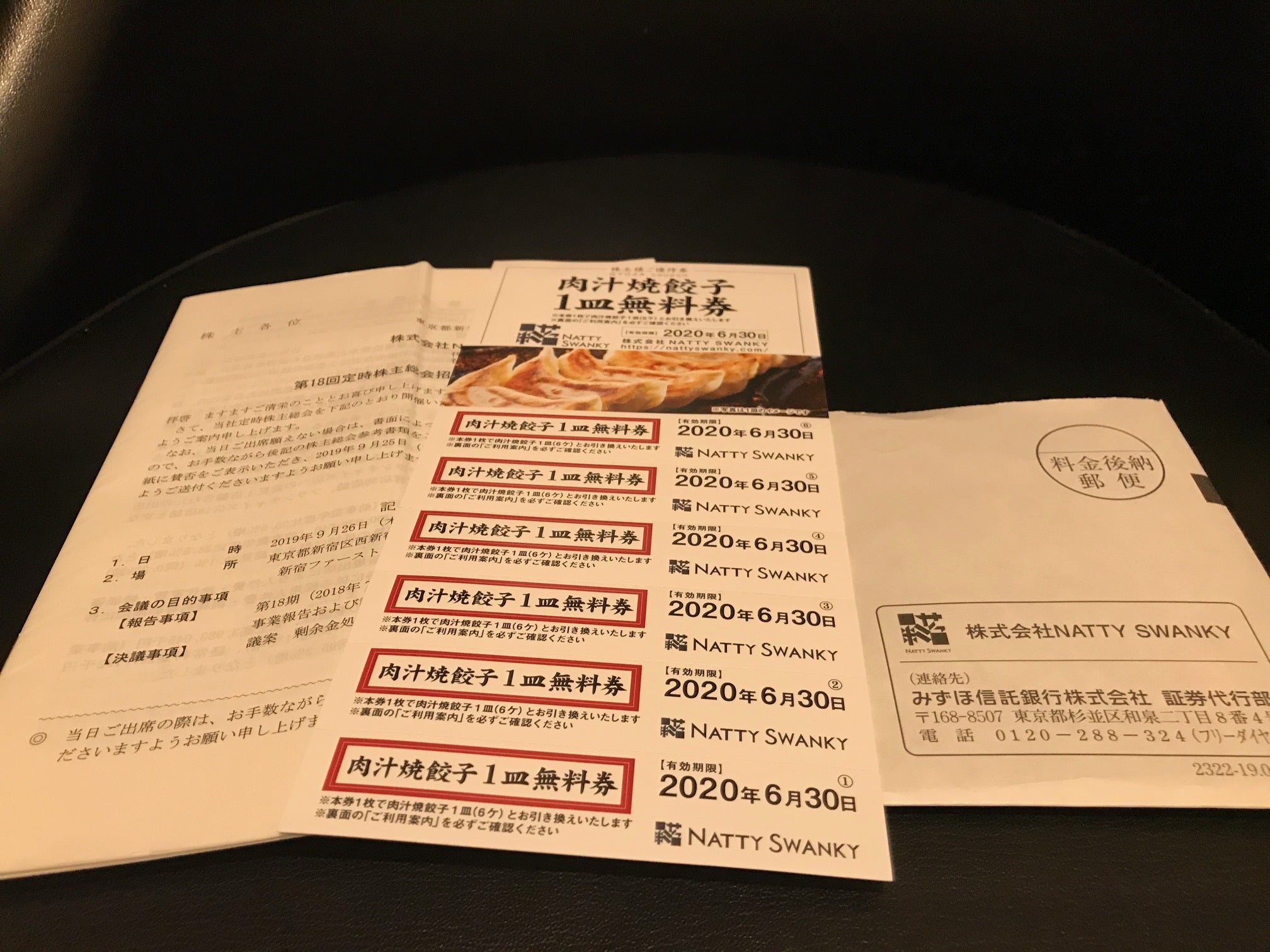NATTY SWANKYは株主優待制度を導入しており、単元株以上を保有する6月末の株主に対して、肉汁焼餃子1皿無料券を6枚進呈しておりますので、配当優待利回りは約1.14%となります。