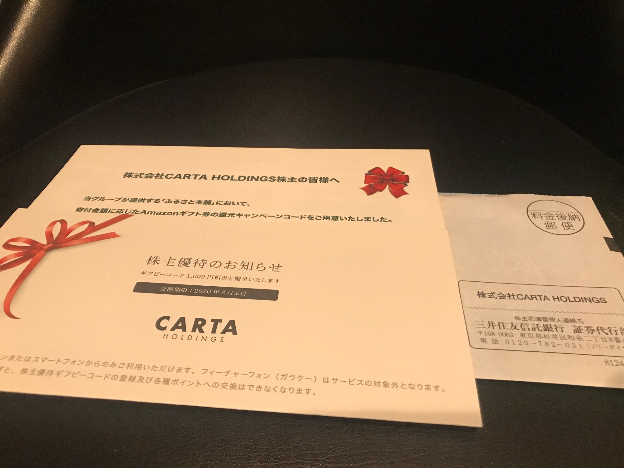 CARTA HOLDINGSは株主優待制度を実施しており、6月末・12月末時点の単元株主に対して、 ”nanaco”や”WAON”等に交換可能な1,000円相当のギフトコードを進呈しておりますので、単元保有時の配当優待利回りは約2.71%となります。