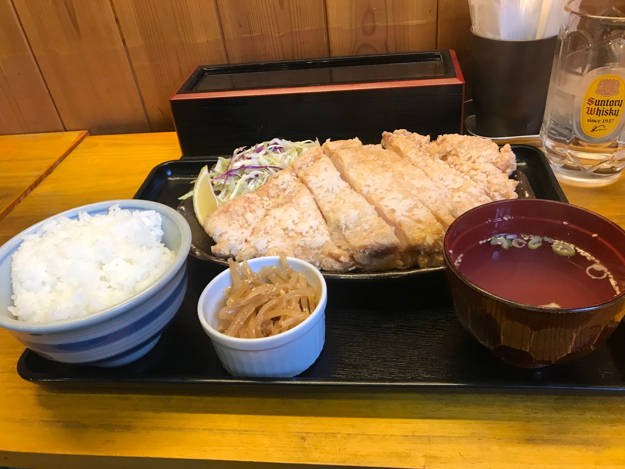 待つこと10分、実際に提供されたのがこちらです。一見してロースカツ定食みたいな外見ですが、一枚揚げであり、びっくりするほどの厚みがあります。税抜990円は松本のランチ価格としては高いかな・・・と思ったのですが、国産鶏を使用しており、かつこのボリュームで供されるのなら納得のプライシングと言えます。お味の方も見た目より油っぽくなく、意外にサクサクいただけます。