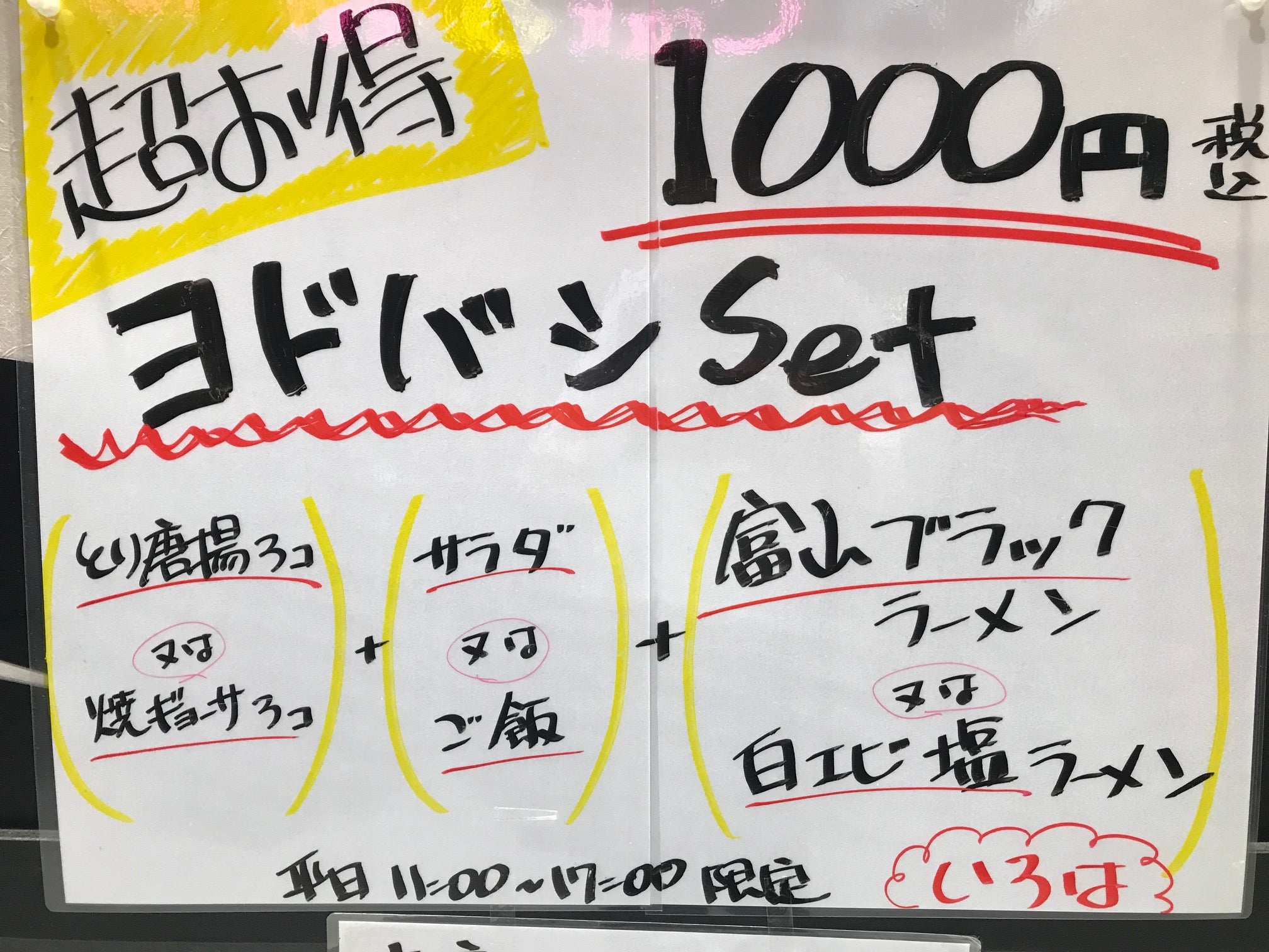 平日の11時~17時限定で、メイン「富山ブラックラーメンor白エビ塩ラーメン」のいずれか一品と、「サラダorライス」、「とり唐揚3個or焼ギョーザ3個」のプリフィックスで税込1,000円となります。