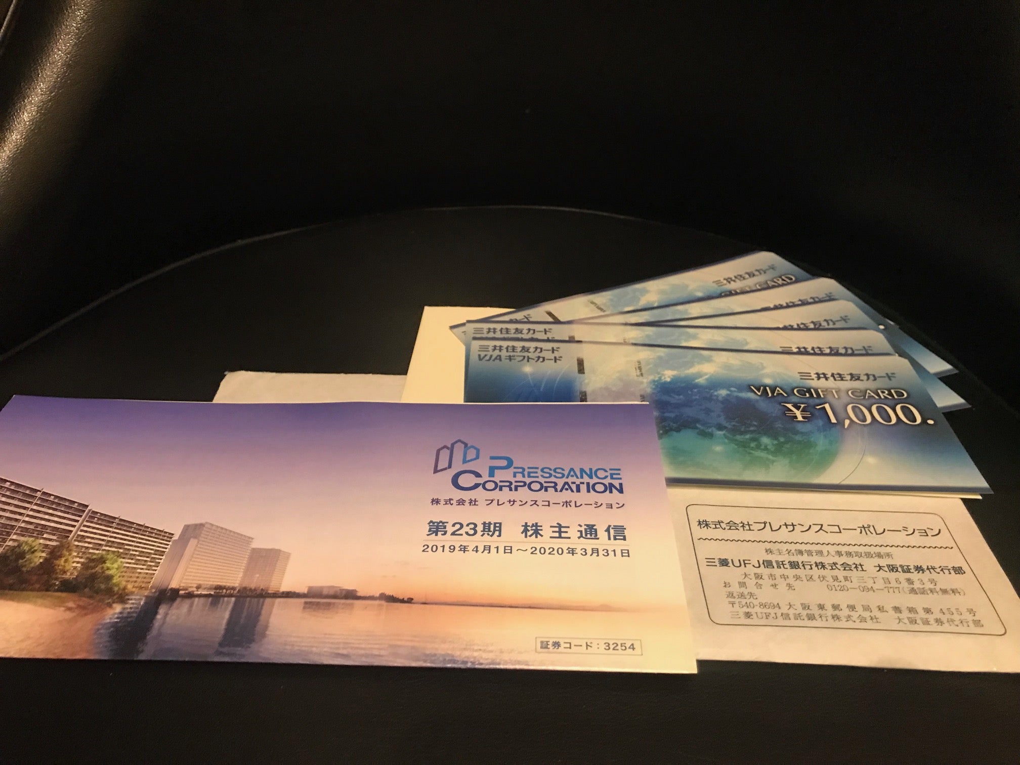 プレサンスコーポレーションは株主優待制度を実施しており、3月末に4単元株を保有する株主に対して、5,000円分のVISAギフトカードを進呈しておりますので、4単元保有時における配当優待利回りは約3.86%となります。