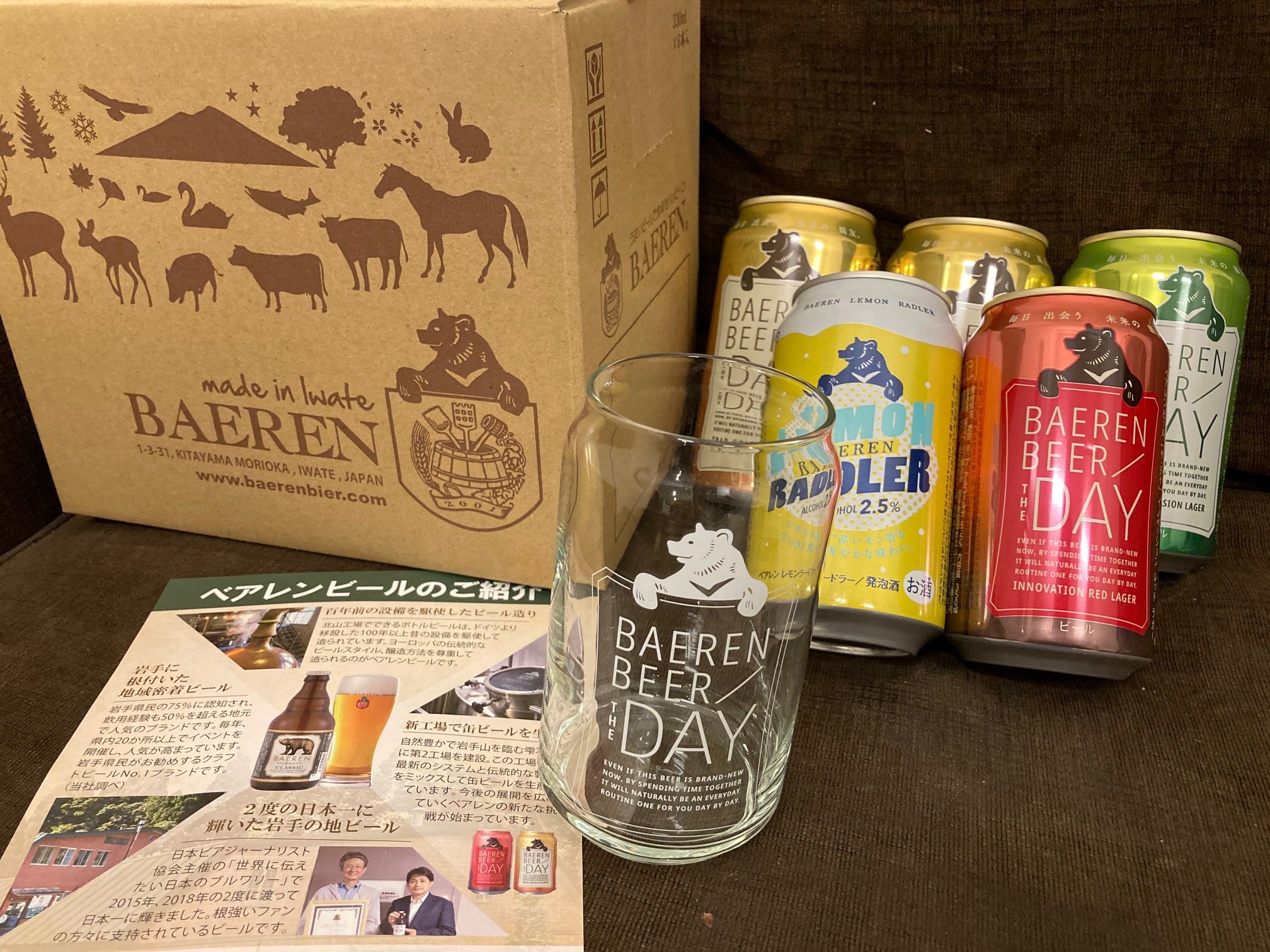 岩手県盛岡市にあるベアレン醸造所という醸造所のビール詰め合わせです。ザ・デイシリーズ3種類(定番トラッド、アロマ、レッド)にレモンラードラーを加えた計4種類5本と、グラスのセットです。このザ・デイシリーズの缶と同じデザインのグラスカンがどうしても欲しくて入手しました。グラスの飲み口が部分が狭いので洗いにくそうな点は難ですが、しっかりした出来具合には満足しています。
