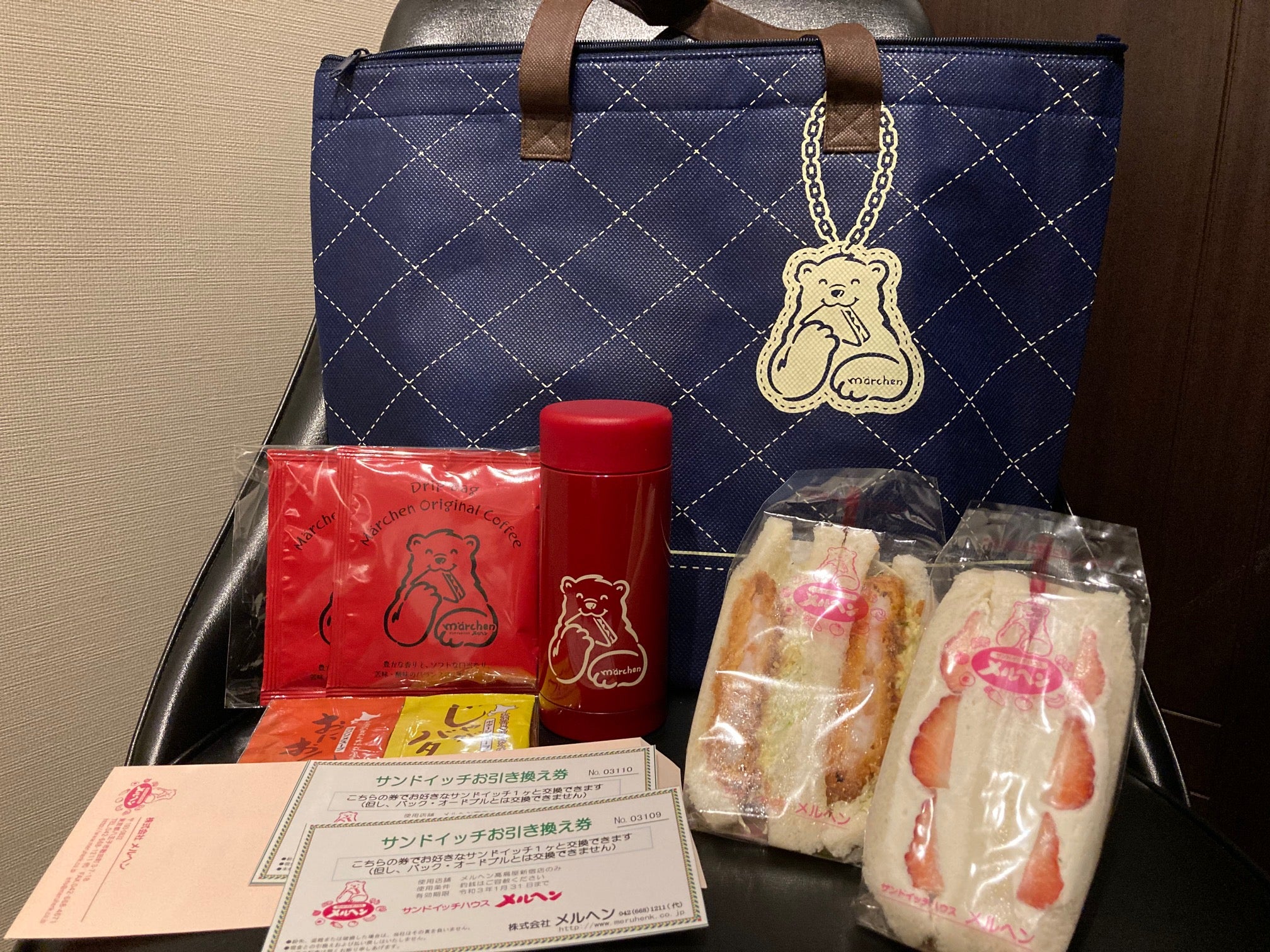 店頭では4,800円相当?と云われたと記憶しています。保冷バッグ(赤/青選択可、クマ柄入)、いちごサンド、海老カツサンド、後日使えるサンドイッチ引換券が2枚、サーモスっぽい水筒(クマ柄入)、ドリップコーヒー2杯分、スープ2杯分が入っています。引換券の期限が1月月内限り、かつ、発行店のみ引換可ということで条件が厳しいですが、それ以外は満足出来る内容です。百貨店系のサンドイッチはこのメルヘンと三桂サンドイッチ「BLOSSOM & BOUQUET」が2強かと思いますが、三桂の方も店によっては福袋が存在する模様です。