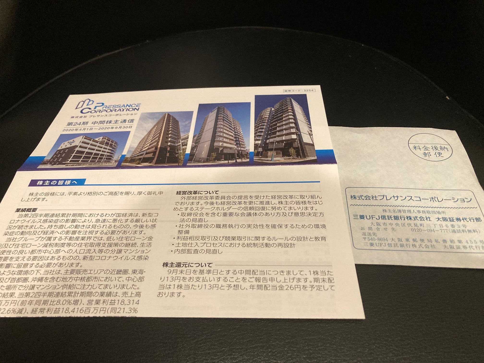 プレサンスコーポレーションは株主優待制度を実施しており、3月末に4単元株を保有する株主に対して、5,000円分のVISAギフトカードを進呈しておりますので、4単元保有時における配当優待利回りは約3.38%となります。