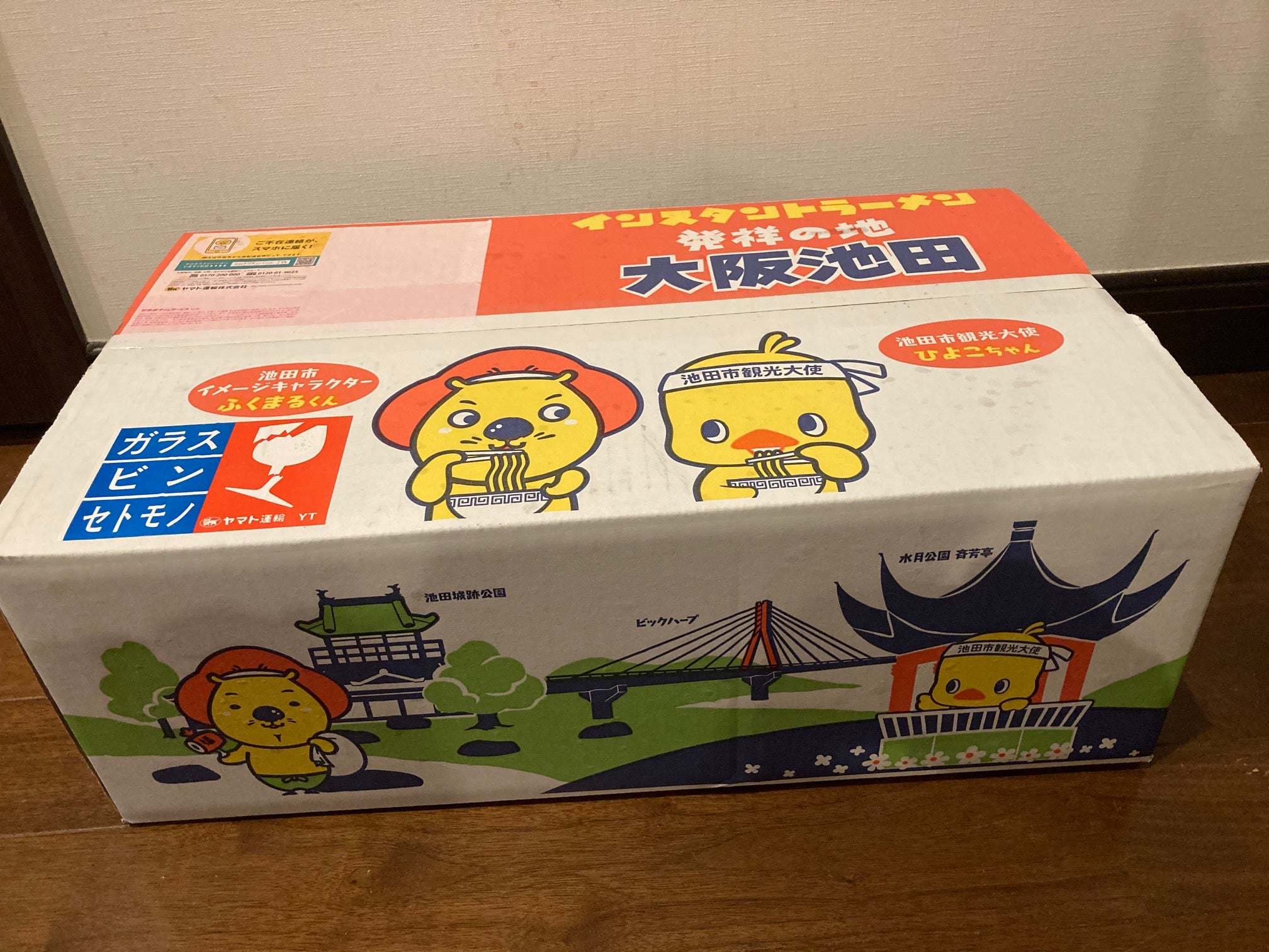 2019年の総務省のガイドライン改定により返礼品が地場産品であることが厳しく指定されたため、日清の工場が市外にあることを理由に池田市が自主的に返礼品から除外していたものの、「自治体の広報目的であることが明白なもの」であることをアピールし直すことで総務省のお墨付きを得て、昨年より復活させています。かような経緯もあって、外身の段ボール段階から大変気合の入った作り込みになっています(笑)。