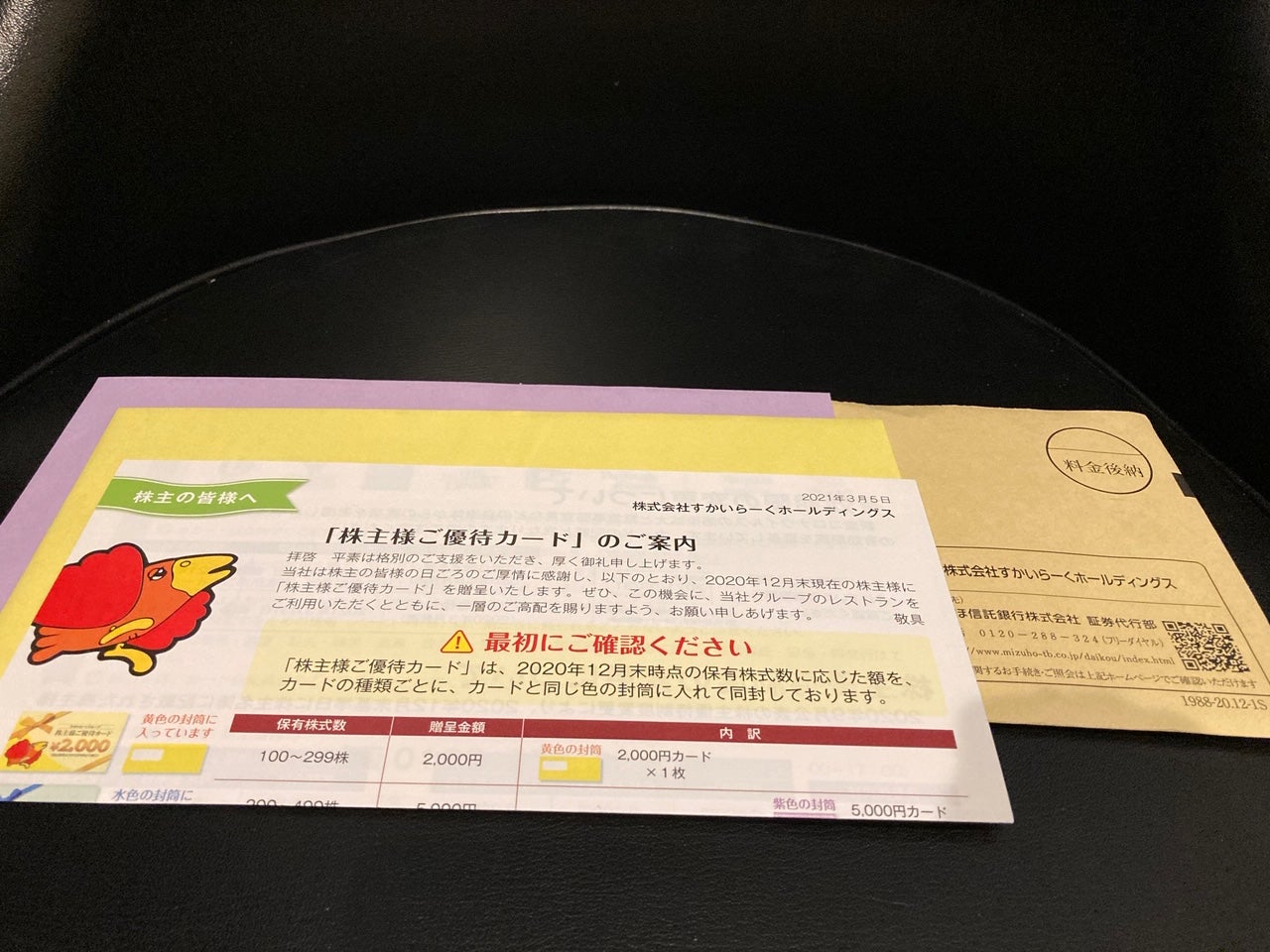 すかいらーくは株主優待として6月末・12月末の単元株主に対し、2,000円分のお食事券を年2回進呈しているため、優待利回りは約2.36%となります。なお、1,000株までは持株数に応じた優待券がほぼ正比例で追加されます。