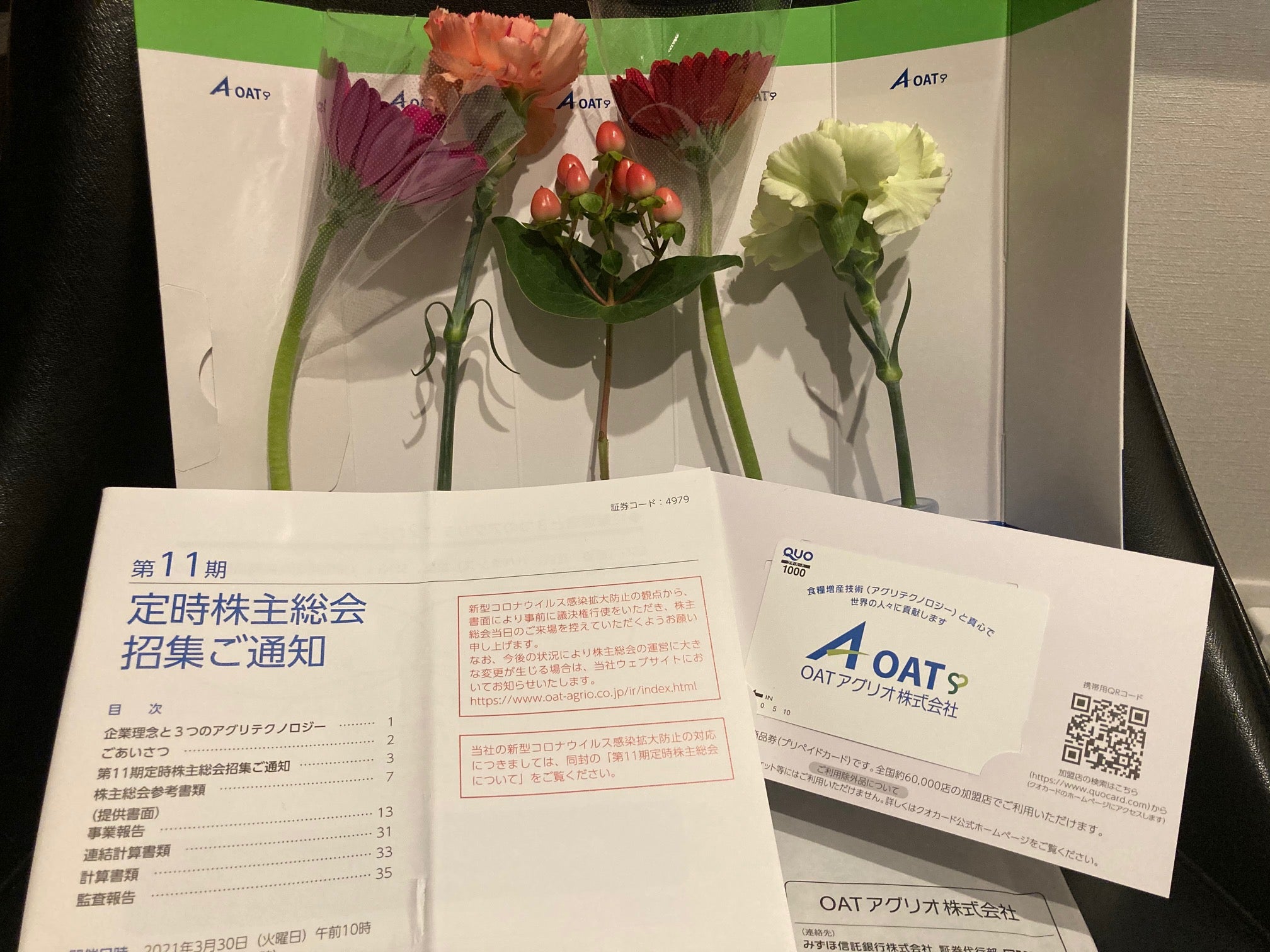 OATアグリオは株主優待制度を導入しており、12月末に単元株を保有する株主に対して、1,500円分の自社製品(肥料、生花等)を進呈しておりますので、配当優待利回りは約3.73%となります。また、1年以上の長期保有株主に対しては1,000円分のクオカードを別途進呈しておりますので、この場合における配当優待利回りは約4.45%となります。