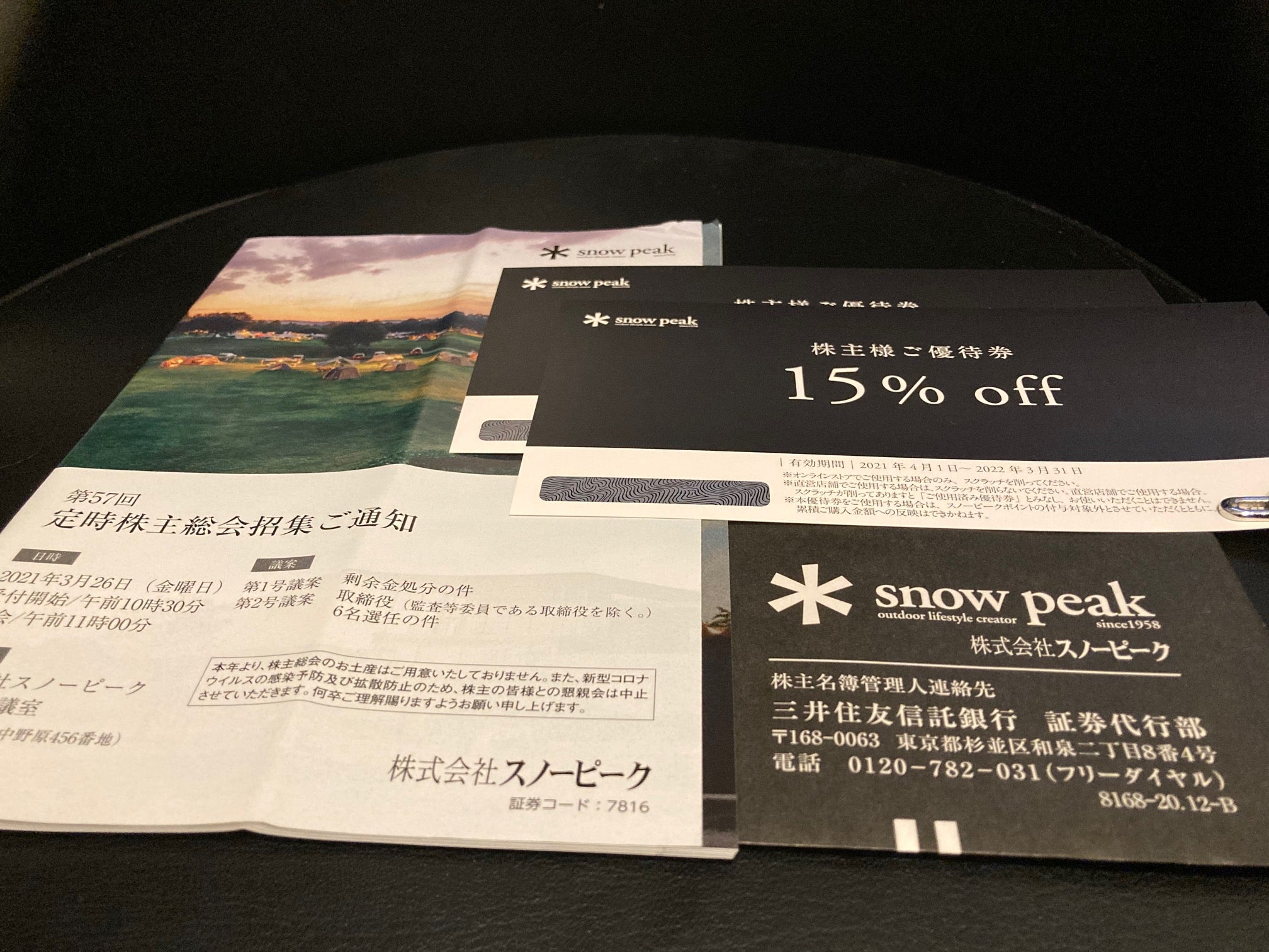 スノーピークは株主優待制度を実施しており、12月末現在1年以上保有を継続する単元株主に対して、当社製品の購入割引券(15%割引)を1枚進呈しています。