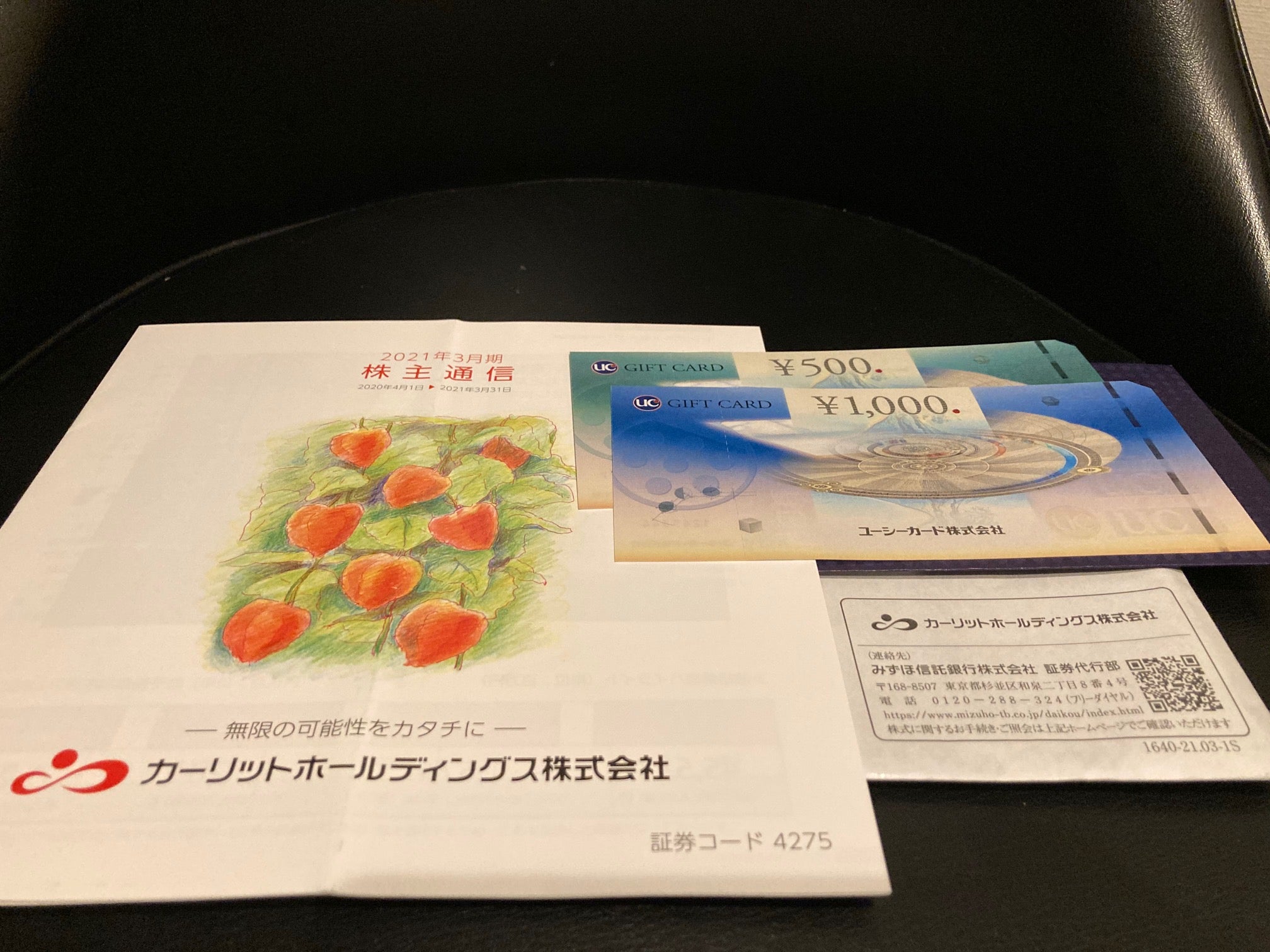 カーリットホールディングスは株主優待制度を導入しておりまして、3月末の100株以上の株主に対して、500円分のUCギフトカードを進呈しておりますので、配当優待利回りは約2.34%となります。なお、3年以上の長期保有で進呈額が1,500円となりますので、同利回りは約3.72%となります。