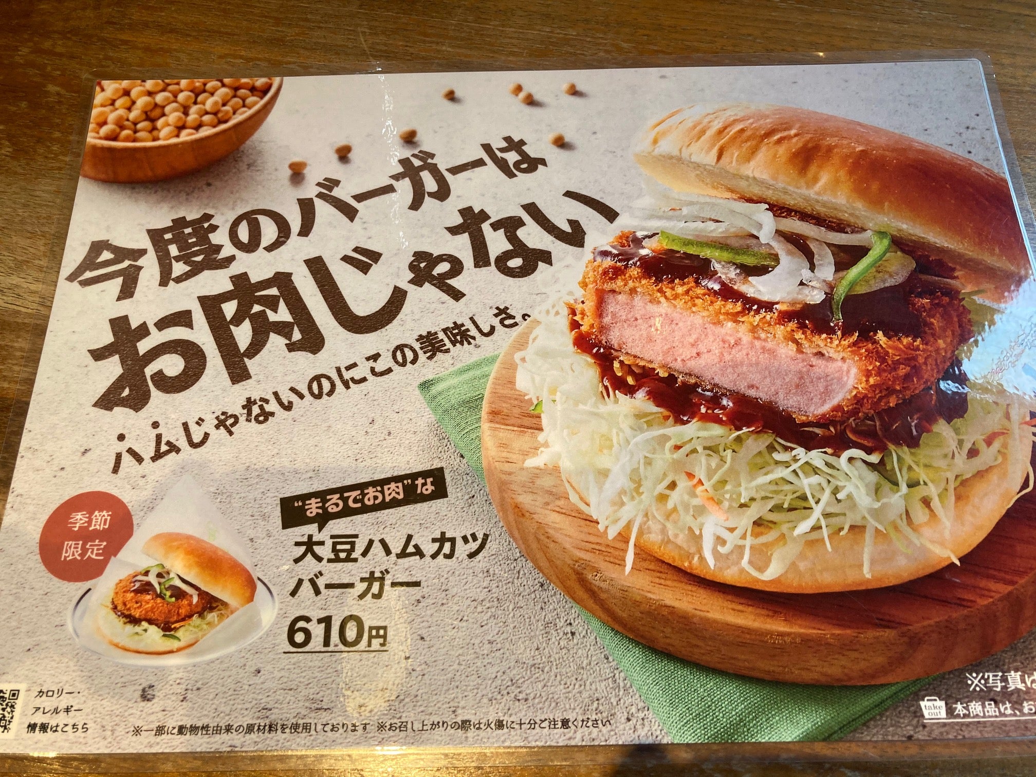 さて今回は「大豆ハムカツバーガー/税込610円」をいただきました。