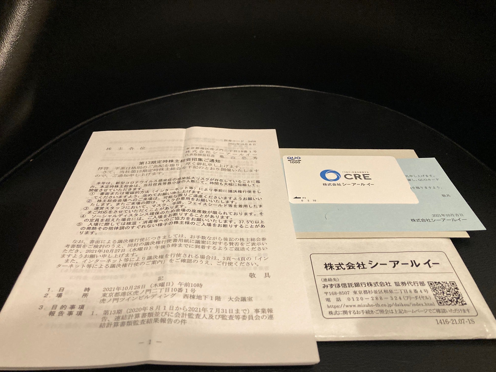 シーアールイーは株主優待制度を実施しており、1月末・7月末の単元保有株主に対して、500円分、7月末の株主に対しては1,000円分のクオカードを進呈しておりますので、配当優待利回りは約2.24%となります。