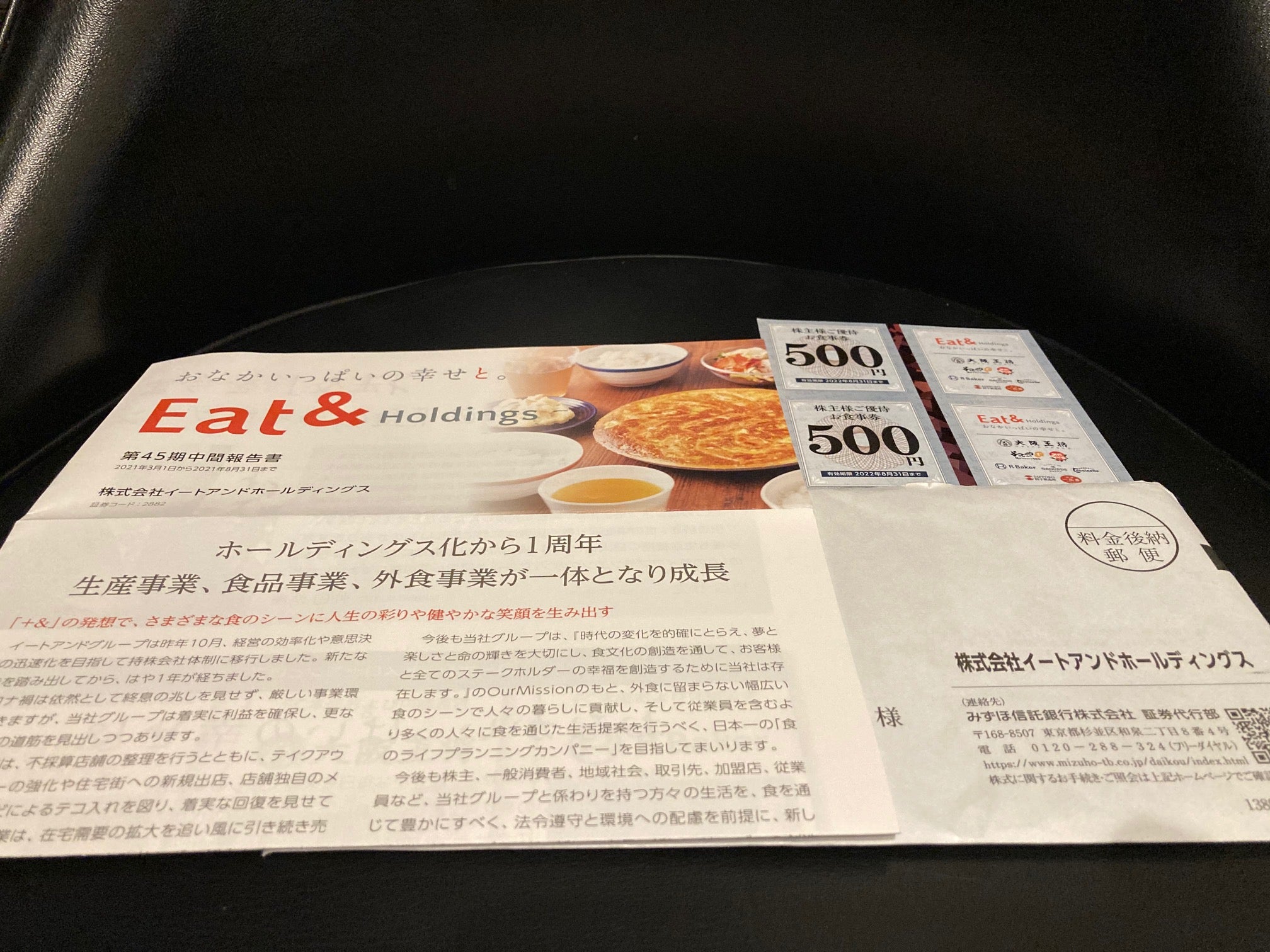 イートアンドホールディングスは株主優待として、2月末・8月末に100株以上を保有する株主に対して合計5,000円相当の食事券、自社製品等を進呈しておりますので、配当優待利回りは約2.83%となります。