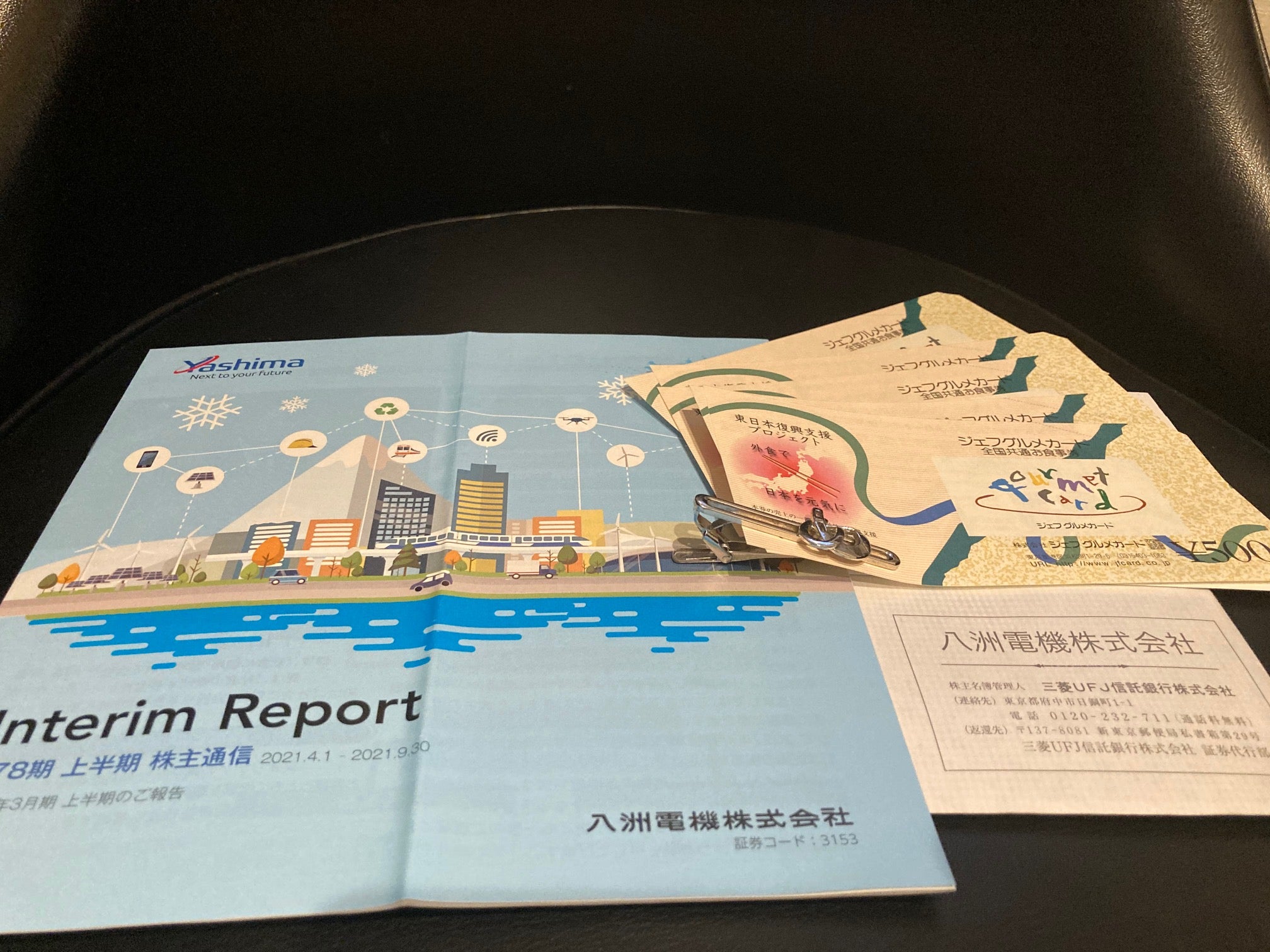 八洲電機は株主優待を導入しており、9月末現在の100株以上保有の株主に対して、500円分のジェフグルメカードを進呈しておりますので、配当優待利回りは約2.82%となります。なお、1年以上保有を継続する株主に対しては500円分が追加されますので、配当優待利回りは約3.34%となります(※2単元の場合は変則優待:2,000円分、1年超で2,500円分、3年超で3,000円分)