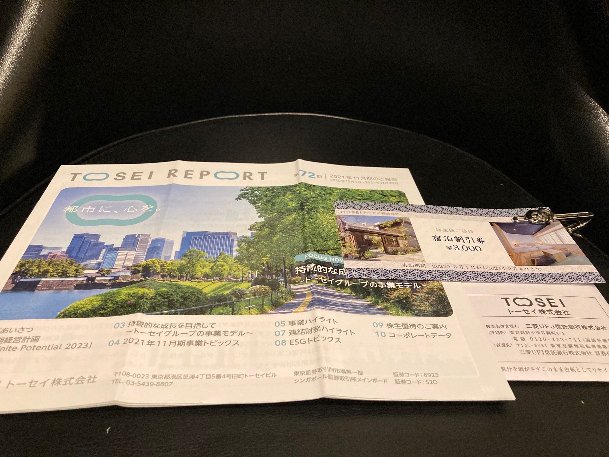 トーセイは株主優待制度を実施しており、11月時点の単元保有株主に対して、当社運営ホテルの共通宿泊券3,000円相当を1枚進呈しておりますので、単元保有時想定配当優待利回りは約6.91%となります。また、継続保有期間1年超・2年超・5年超でクオカードを1千円・2千円・3千円別途進呈していますので、長期保有により同利回りは約8~9%超となります。