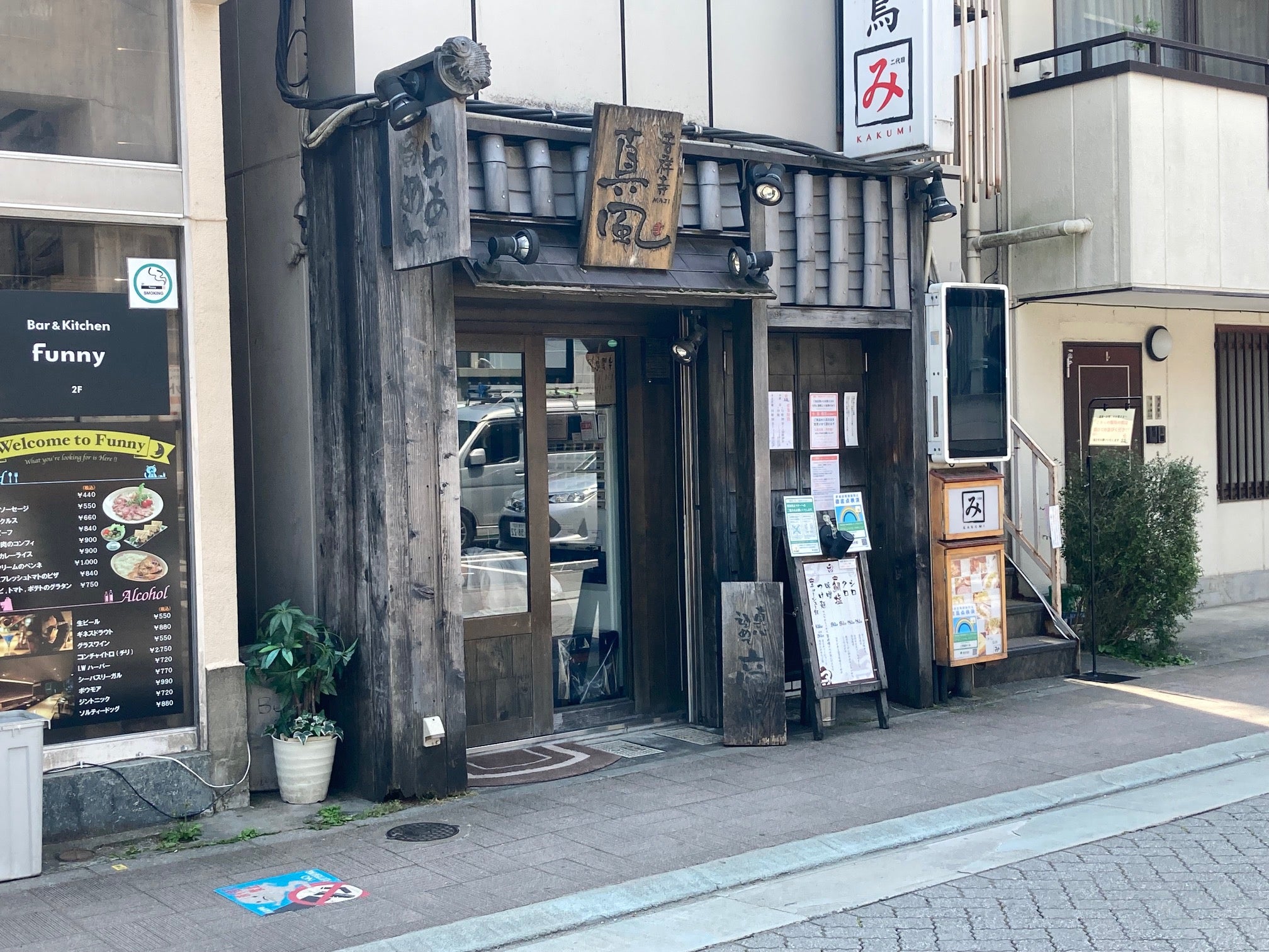 さて今回はJR・京王井の頭線吉祥寺駅徒歩3分の「真風」に行ってきました。場所は吉祥寺駅南口(要は井の頭公園口)を出て、丸井などがある右寄りの公園側ではなく、左寄りのヤマダ電機の方に向かい、東急ホテル前の井の頭通りより一本手前の路地で左折すると程なくしてあります。
