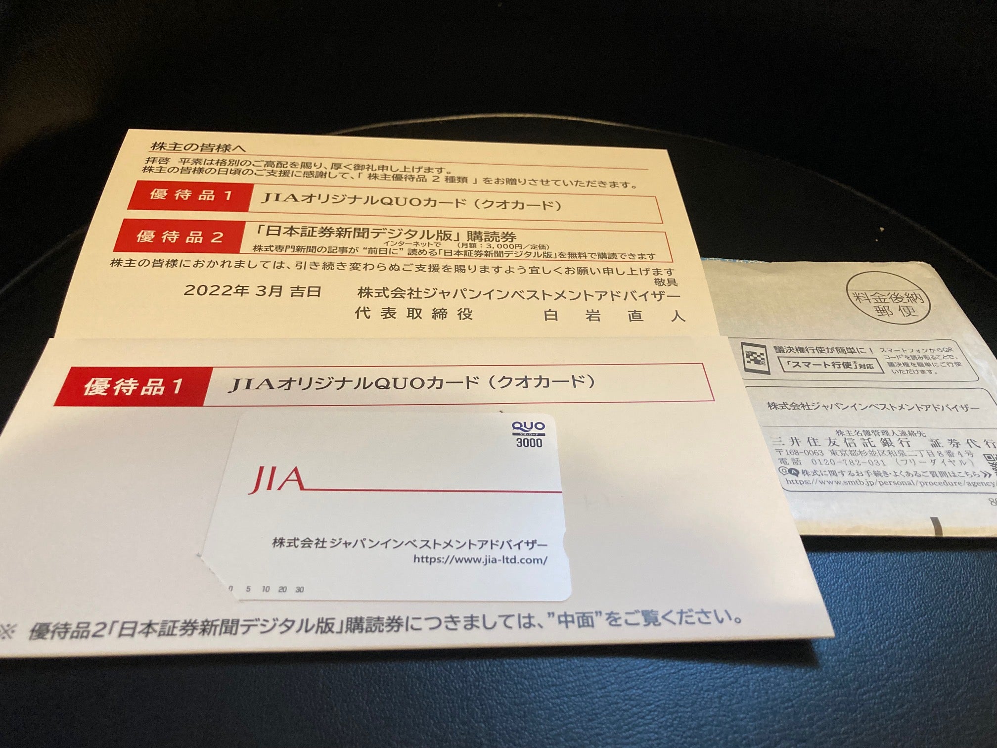 ジャパンインベストメントアドバイザーは株主優待を導入しており、12月末に単元株を保有する株主に対して、500円分のクオカードと日本証券新聞のデジタル版購読券9,000円分を進呈しておりますので、クオカード分だけを計算した場合の配当優待利回りは約2.66%となります。なお、1年超・2年超・3年超保有で更に優遇があり、クオカードについては進呈額が各1,000円分・3,000円分・5,000円分となるため、その場合の同利回りについてはそれぞれ約3.02%・約4.46%・約5.89%となります。