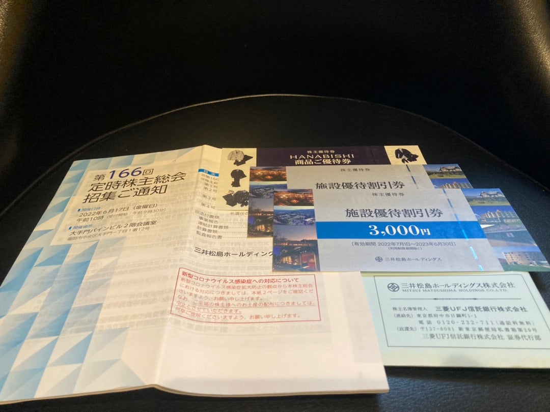 三井松島産業は株主優待制度を実施しており、3月末に単元株を保有する株主に対して、6,000円分の自社運営宿泊施設の宿泊割引券と5,000円分のオーダースーツ等お仕立券を進呈しておりますので、宿泊券のみ計算した場合の配当優待利回は約7.71%となります。