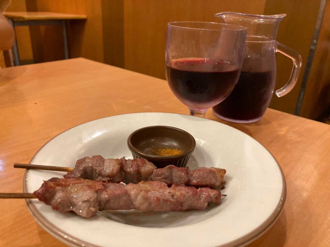 そんなわけで、お約束のハウスワインとアロスティチーニ(ラムの串焼き)です。