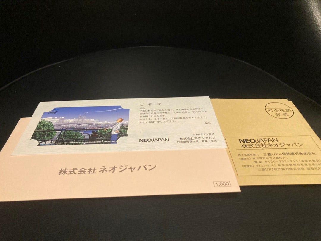 ネオジャパンは株主優待制度を実施しており、100株以上を保有する1月末・7月末の株主に対して500円のクオカードを進呈しておりますので、配当優待利回りは約2.95%となります。