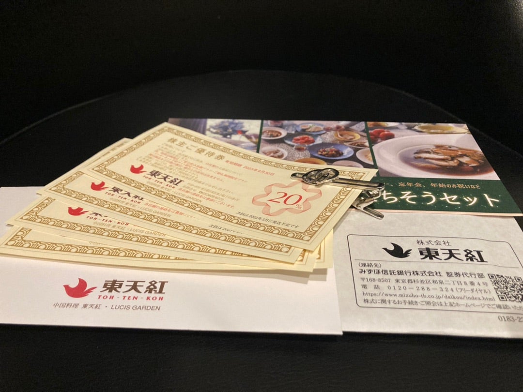 東天紅は単元株を保有する株主に対し、2月末・8月末の2回・20%食事割引券を各4枚進呈しています。なお、0.5単元(端株)保有であっても各2枚進呈されます。