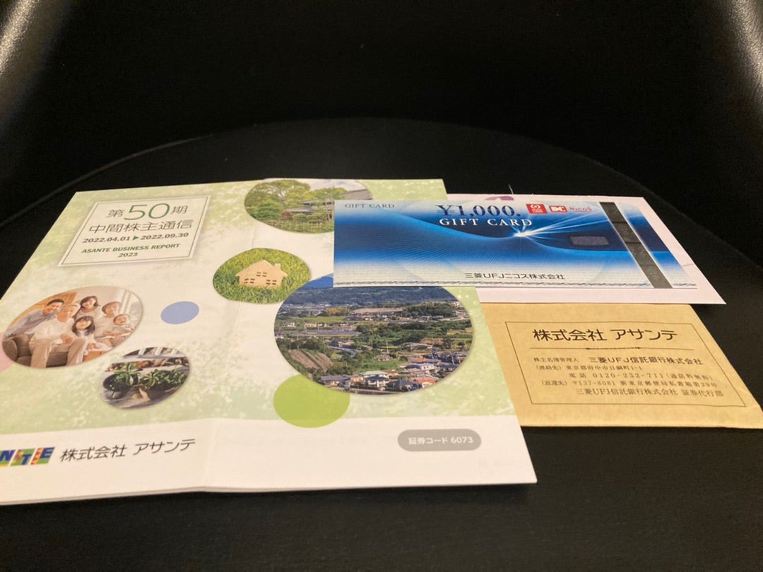アサンテは株主優待制度を導入しており、3月末・9月末時点の単元以上保有株主に対し、三菱UFJニコスのギフトカード1,000円分を年2回進呈しておりますので、配当優待利回りは約4.96%となります。