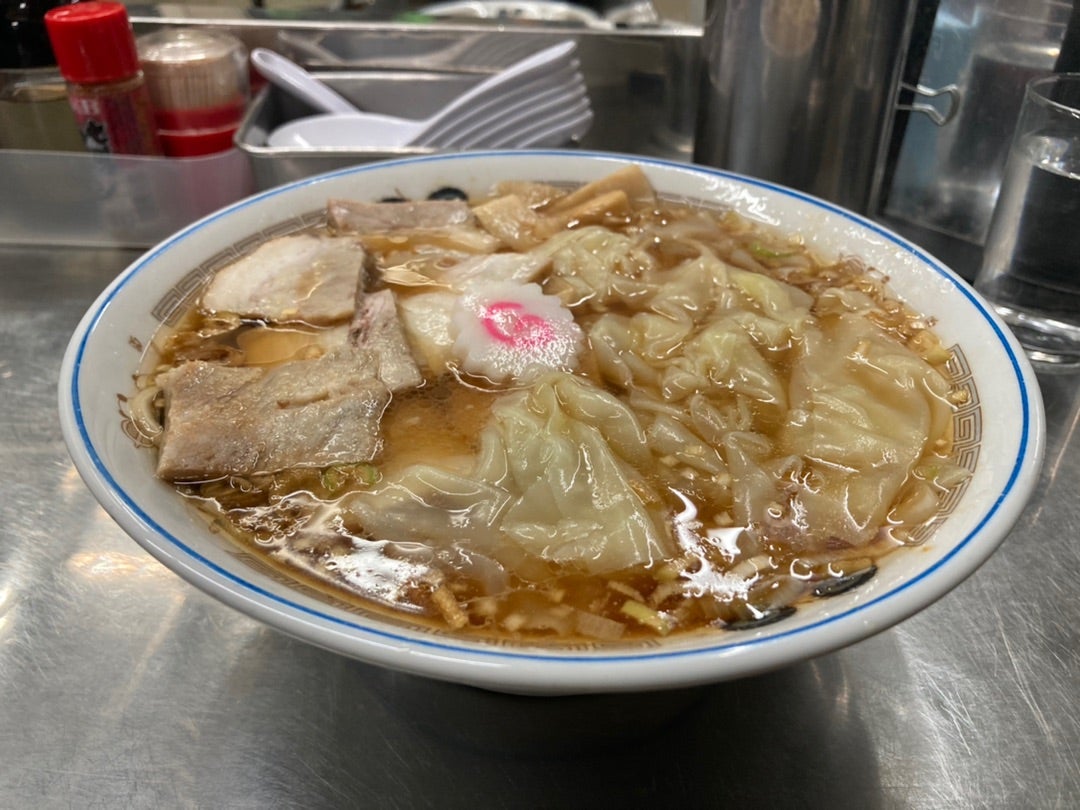 スープはあっさり目の醤油で、イメージ通りの“昔ながらの中華そば”が体現されています。麺は中太のストレート固めで、どことなく蕎麦っぽい食べ応えも特徴的です。ワンタンはアンが殆ど入っていないものの、皮が厚めで量も多いため、ボリューミーな麺も含めて、普通盛りでも十分に満腹になります。