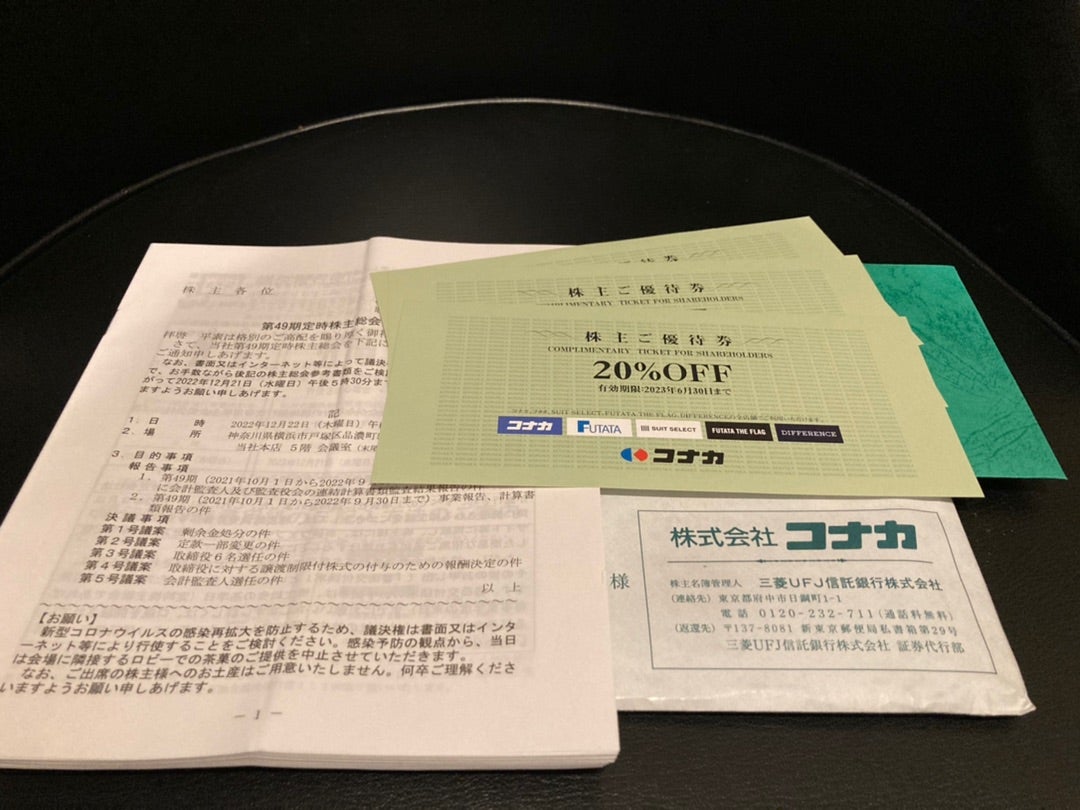 コナカは株主優待制度を実施しており、9月末・3月末時点で単元株を保有する株主に対して、20%割引券を3枚進呈しています。