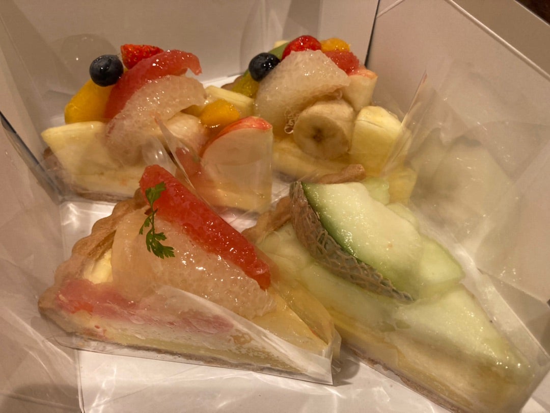 奥のフルーツタルトはド定番の売れ筋商品で、あとはグレープフルーツとメロンショートを選びました。1つ850円~900円位するので合計3,500円程(手出しは500円)でした。居酒屋で3,000円使っても何とも思いませんが、ここでは凄い贅沢をした気分です。