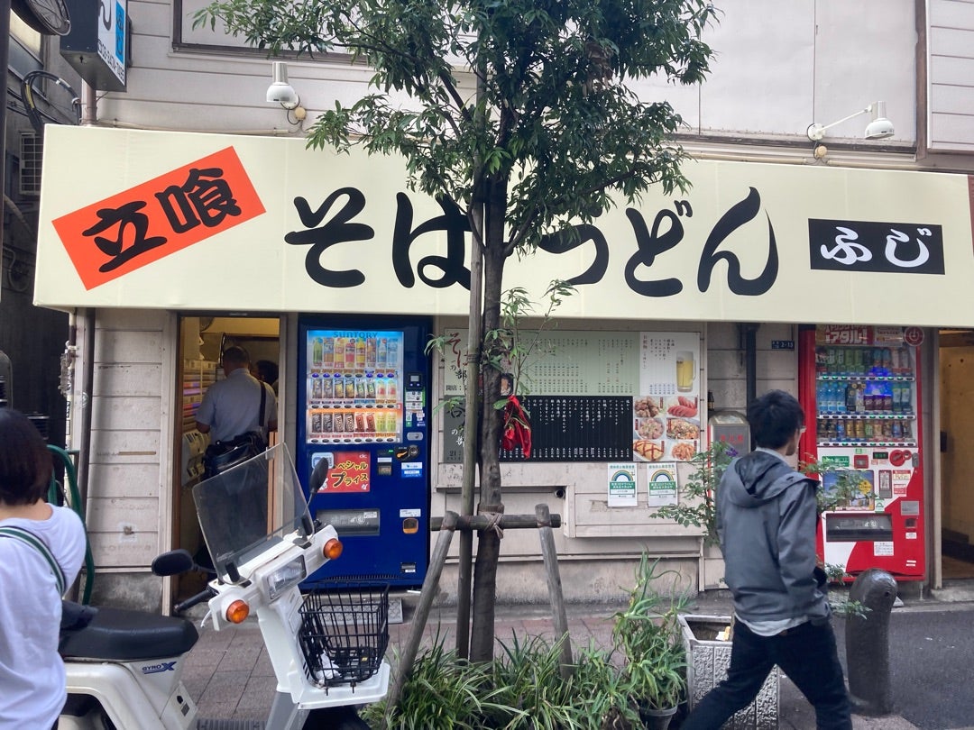 さて今回は品川の「立喰そば・うどん ふじ」に行ってきました。場所はJR品川駅港南口・徒歩1分、通路両脇にサイネージのついた駅の回廊を抜けて、そのまま真っすぐ進み、ペデストリアンデッキの階段を降りると程なくして左側にあります。
