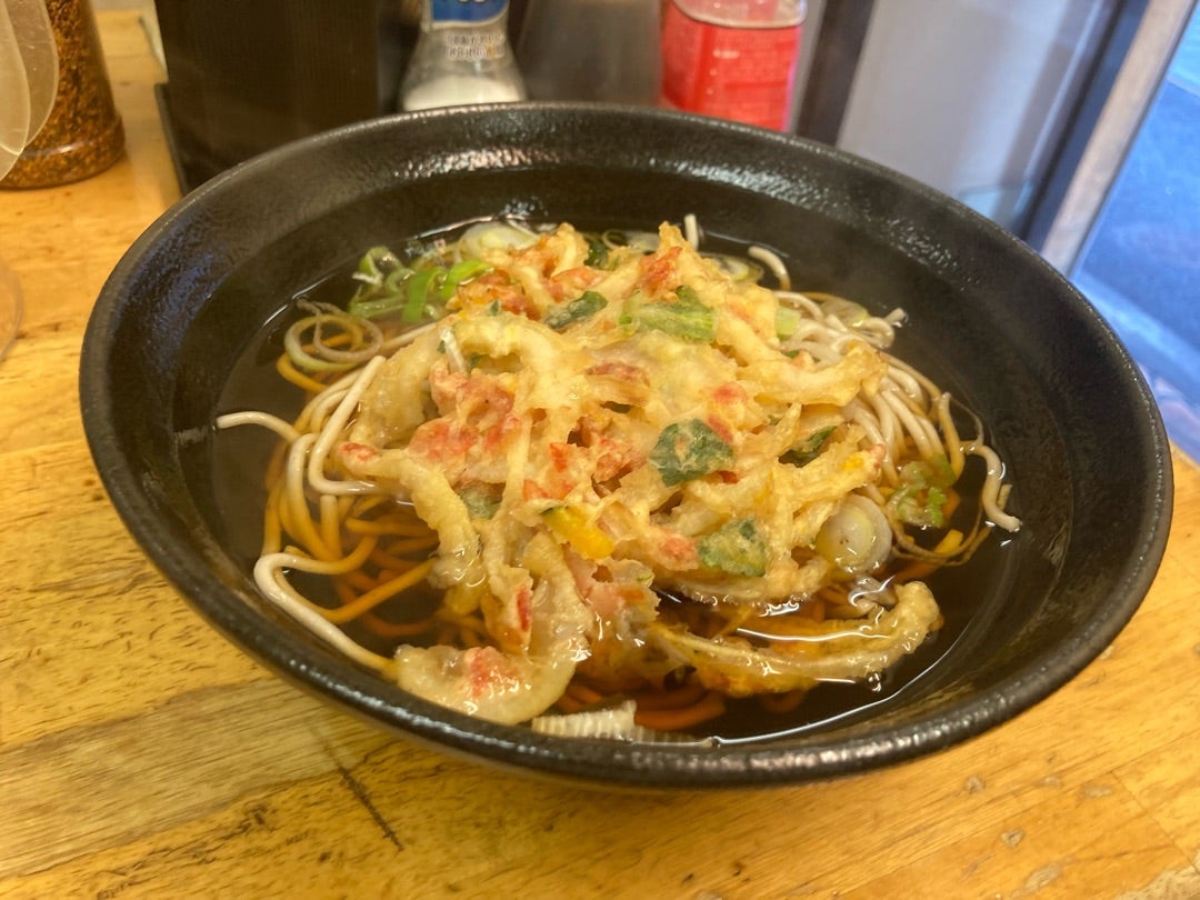 食券をお渡ししたところ、店主がソフト茹で麺を袋からバリっと出して茹ではじめてくれました。想定外の速さで提供されます(笑)。麺はぼそぼその田舎系太麺、つゆはよくある関東醤油系ながらも、思いのほかすっきりとした味わいでした。かきあげは揚げ置きで、玉ねぎ、春菊、紅生姜、長ネギが入っています。