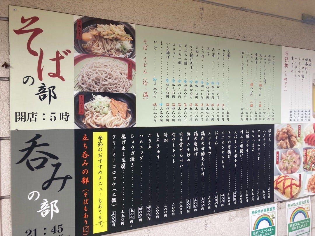 他のメニューはこんな感じです。朝5時からは「そばの部」、夕方17時からは「呑みの部」として、二毛作営業されています。ケース内の天ぷらが二個選べる“天ぷら2個そば(税込み460円)”が人気のようです。