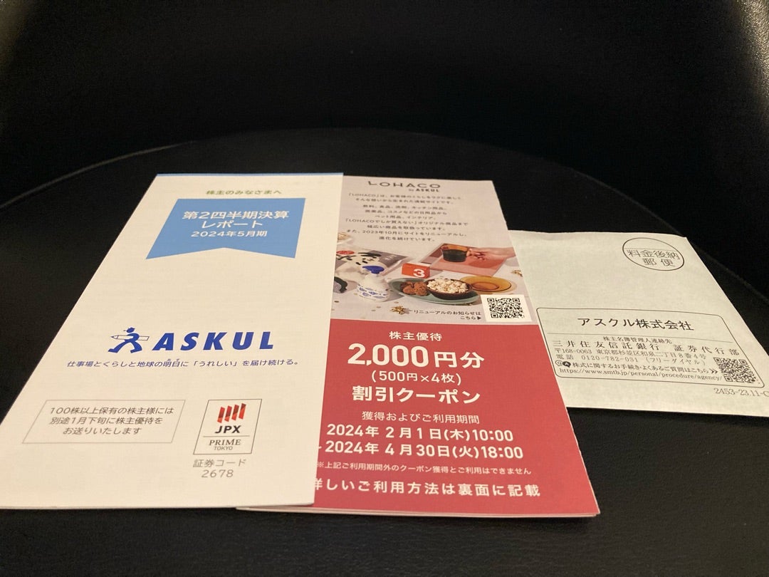 アスクルは株主優待制度を導入しており、5月末・11月末の株主に対して、2,000円分のクーポン(※買上500円超につき、500円使用可)を進呈しているため、配当優待利回りは約3.16%となります。