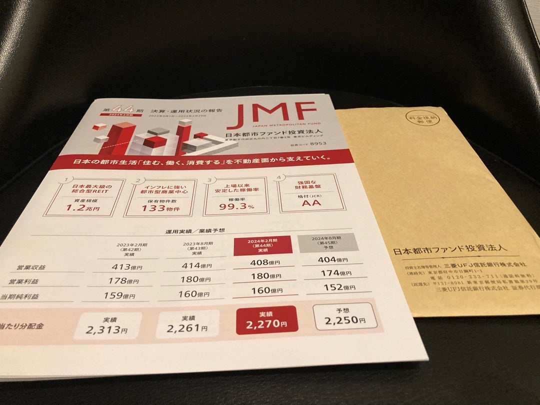 2024年2月期_第44期の落着は、営業収益は第43期比▲1.3%の408億円、経常利益は同▲0.2%の160億円とやや上振れ、分配金は同9円増配の2,270円となりました。第43期取得の8物件の巡行化と赤坂02や肥後橋01の埋め戻し、商業施設やホテル歩合の収入増のほか、水道光熱費収支が想定超に改善しました。他方、売却物件はイオンモール鶴見緑地(25%)とラウンドワン三宮店の2物件に留まり売却益差異(▲5億円)等で出来上がりは減収減益となり、内部留保はネット+1.5億円の繰入となりました。