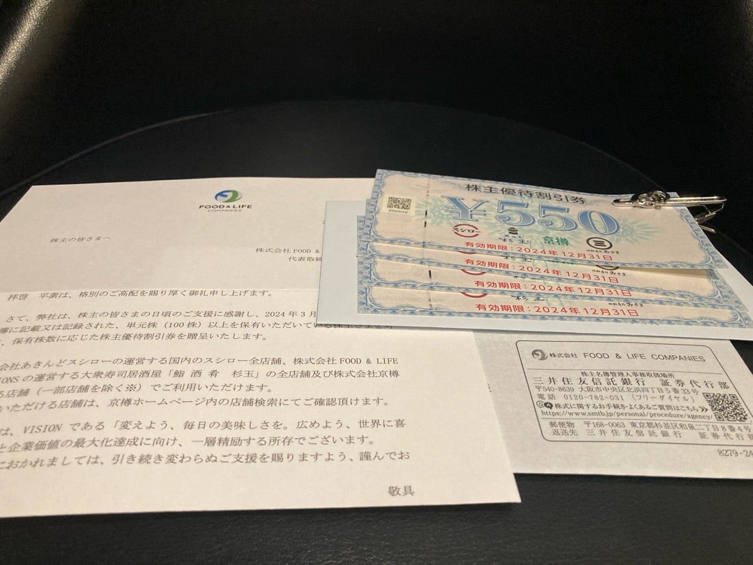 FOOD&LIFE COMPANIESは株主優待制度を実施しており、3月末・9月末時点で100株保有する株主に対して、年2回1,650円分の自社割引券を進呈しておりますので、配当優待利回りは約2.05%となります。