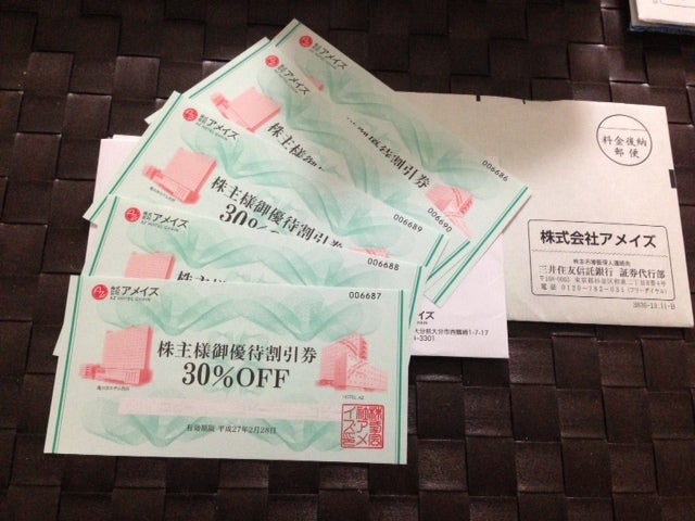 アメイズは単元株以上の株主に対して、30%の宿泊割引の株主優待券を