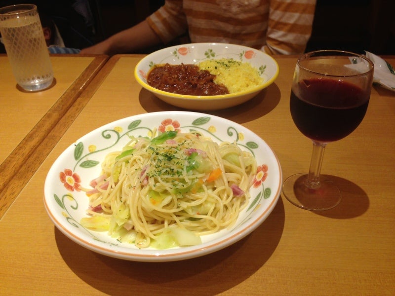 ハヤシライスとキャベツ入りペペロンチーノと赤ワインを頼んで、