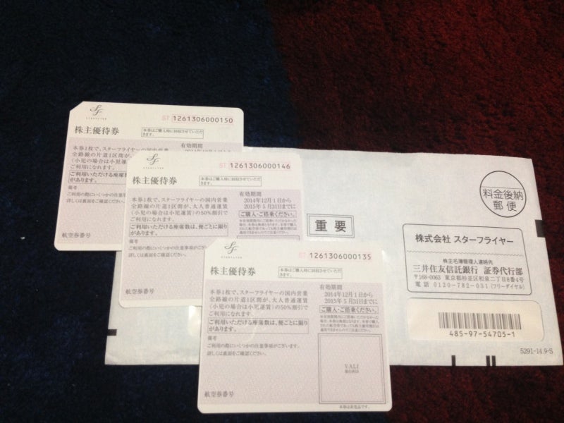 優待券を3枚ずつ進呈しています。金券屋での売値のボラが凄いですが、