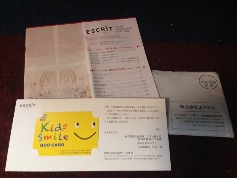 爆速成長企業、エスクリ(2196)から株主優待のクオカードがきました!